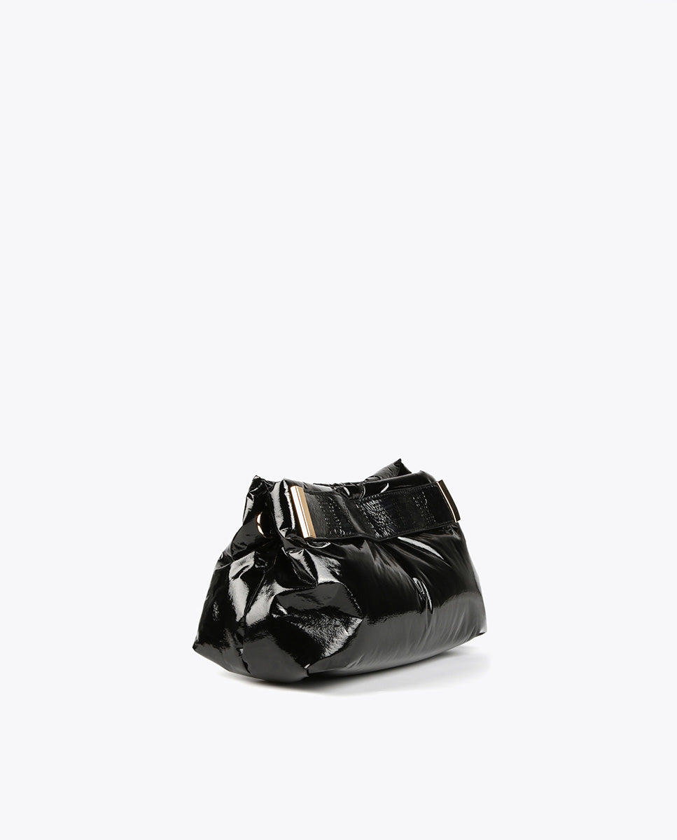 Shiny faux patent leather crossbody bag with detachable chain crossbody strap and logo tape on the front. Magnetic button fastening and inside pocket.