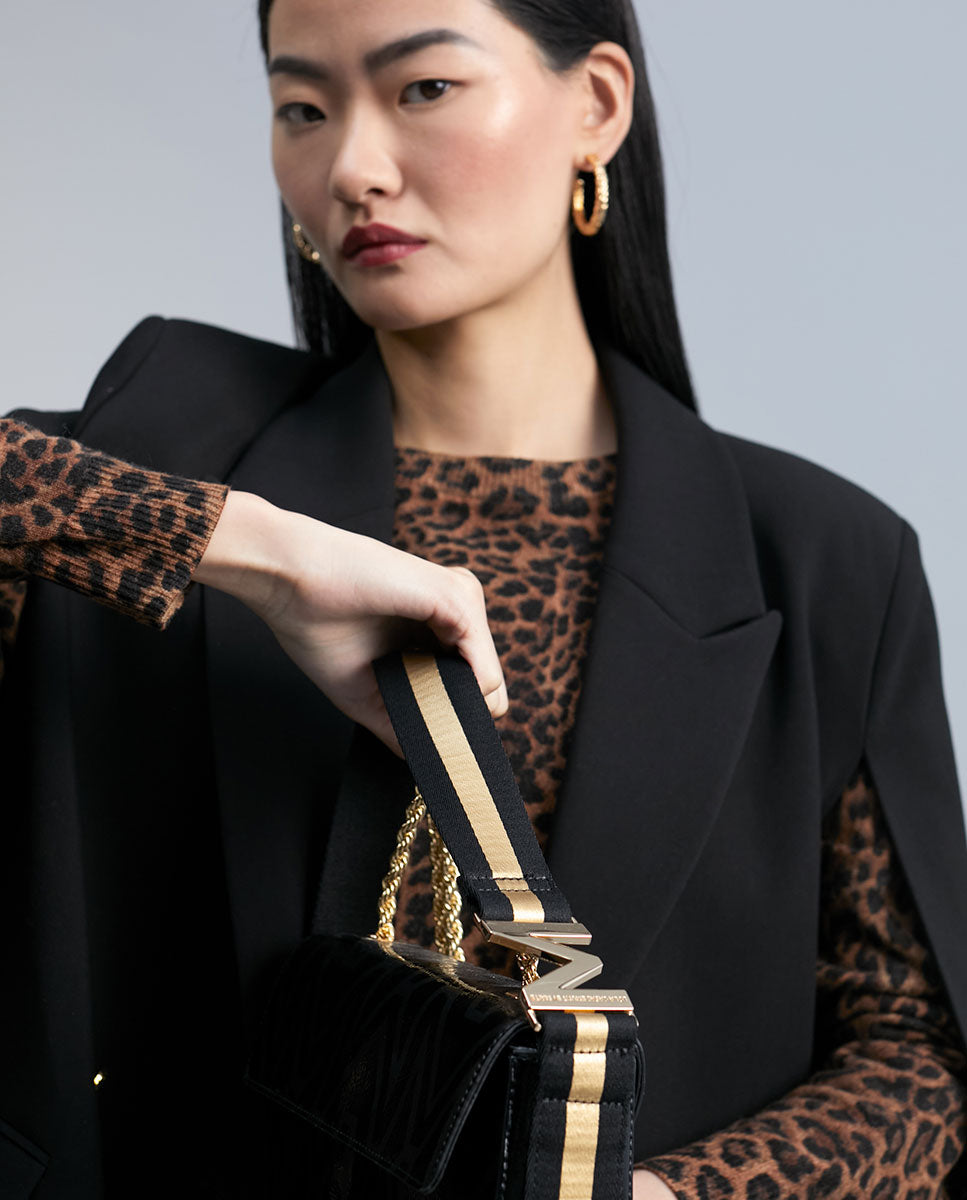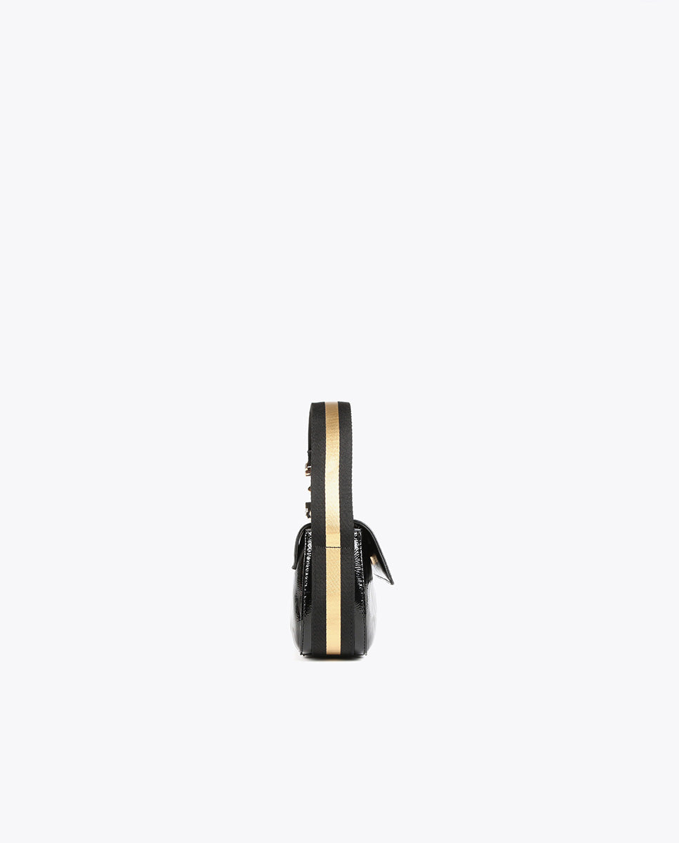 Crossbody bag with printed monogram. Handle and crossbody strap. Magnetic button fastening and gold logo letter detail on the handle.