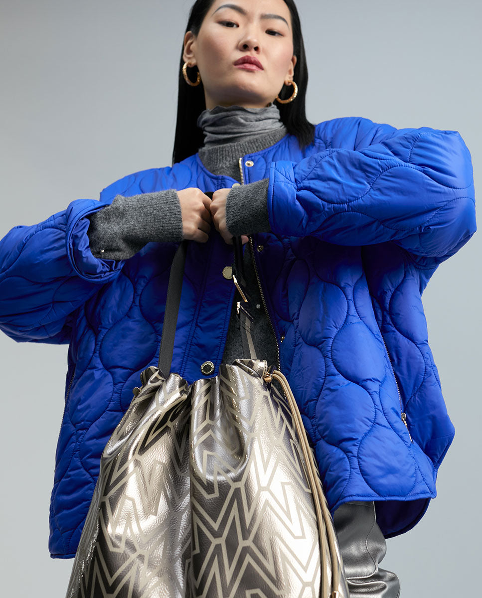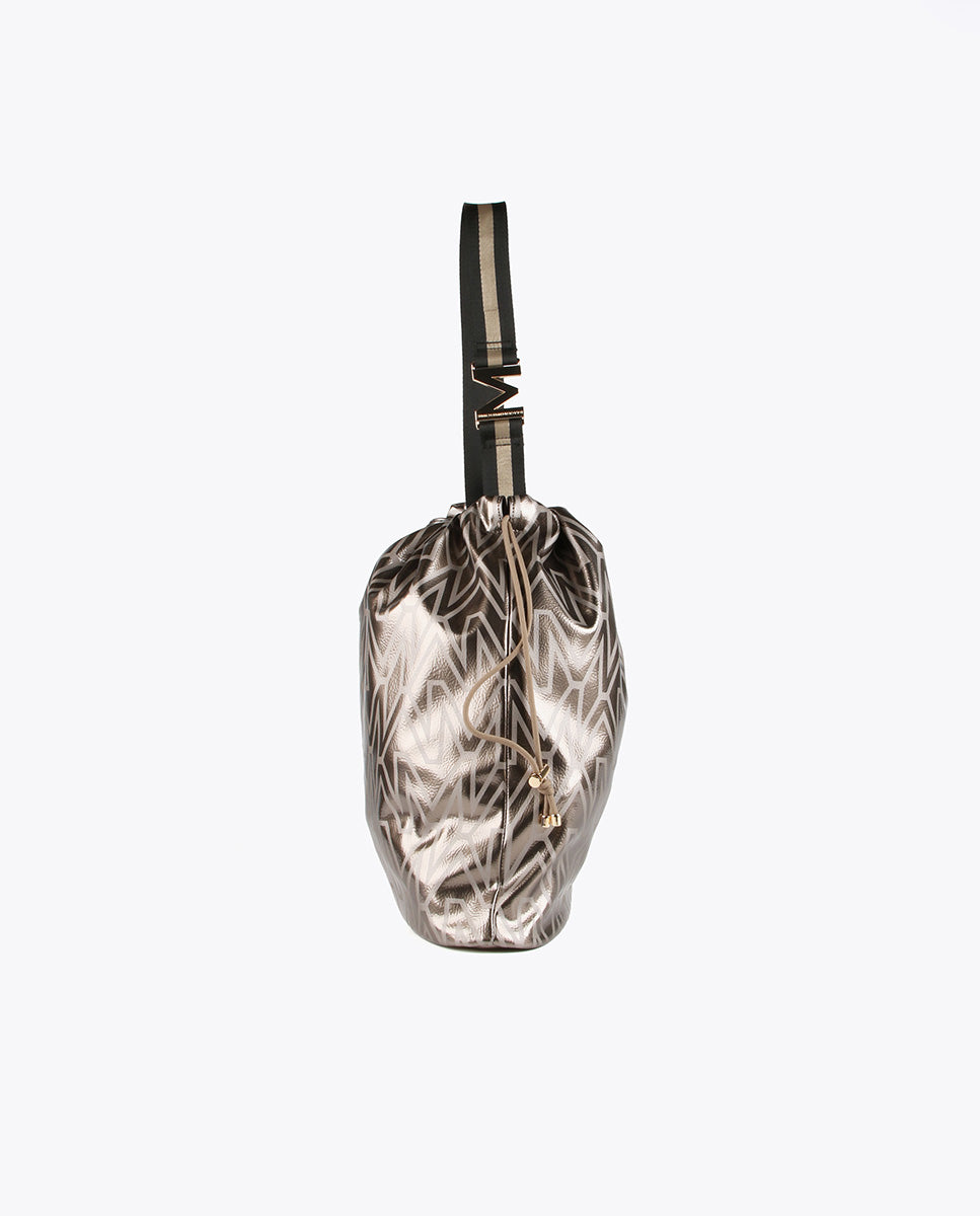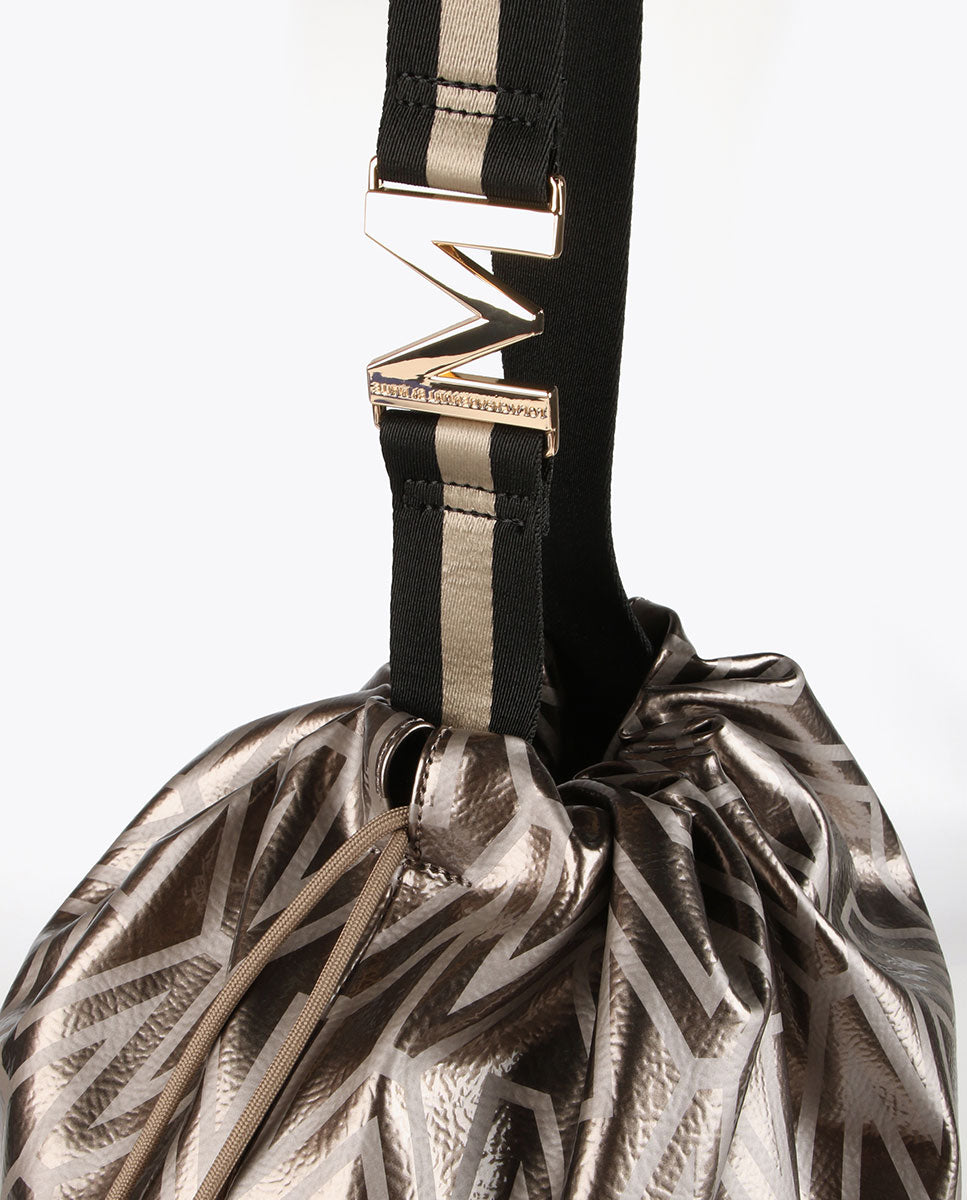 Bucket tote bag with monogram print. Gold logo letter on the strap and adjustable drawstring fastening.