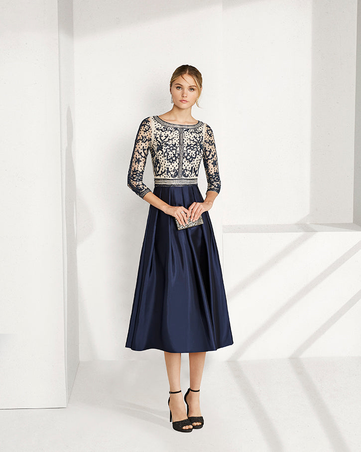 Short cocktail dress in beaded taffeta. Jewel neckline and pleated skirt. Available in beige/navy blue and beige.