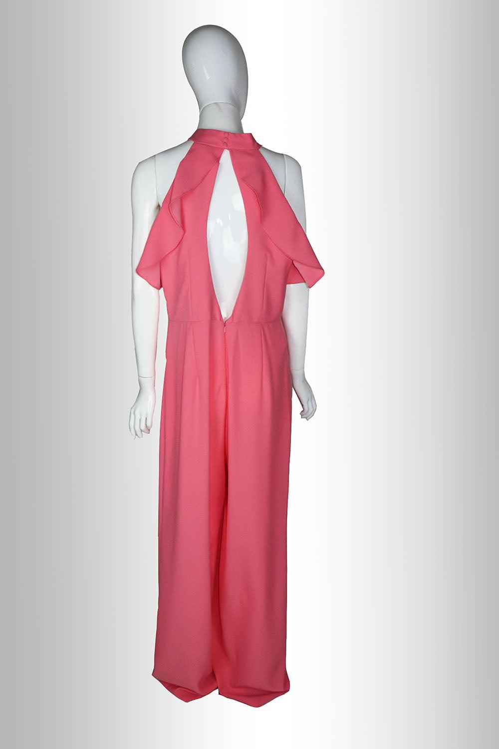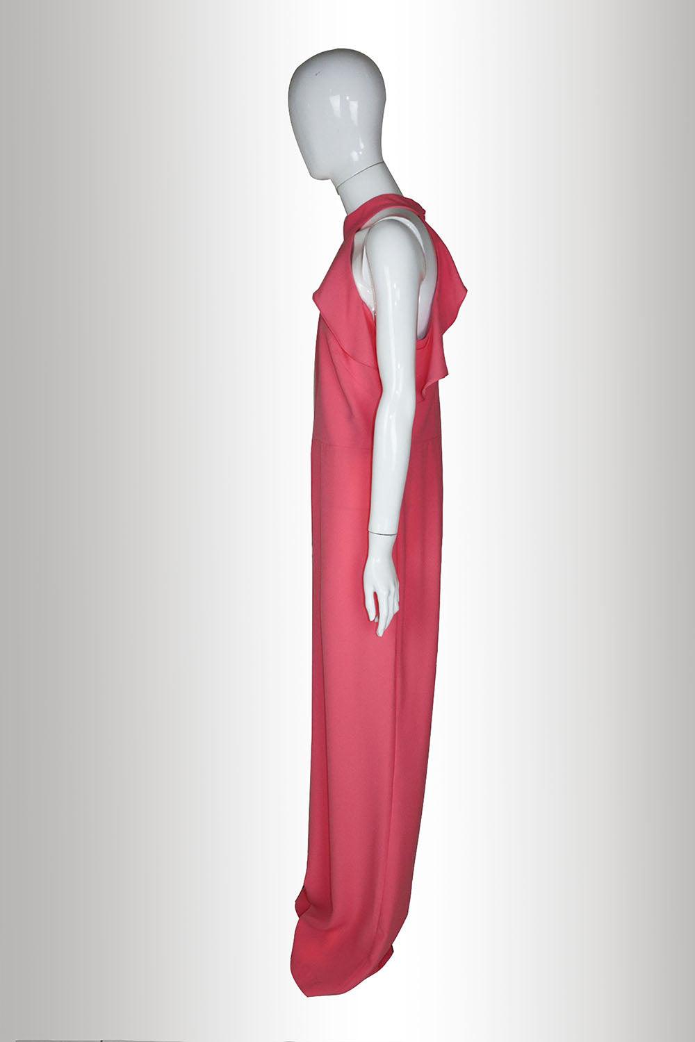 Long cocktail jumpsuit in delavé crepe. Off-the-shoulder halter neckline and low back.
