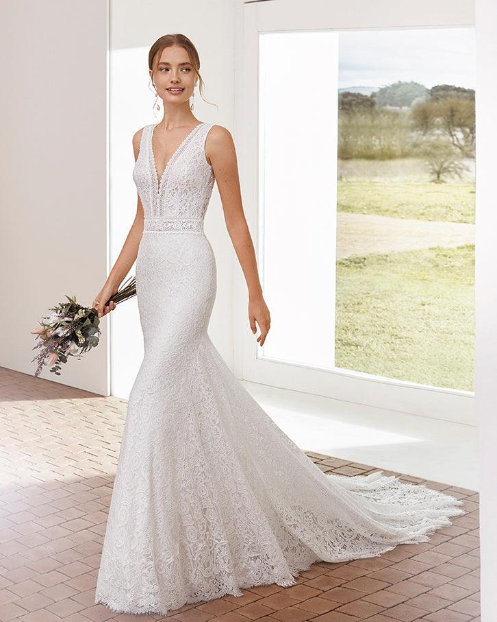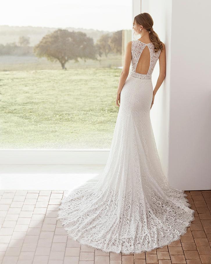 Mermaid-style lace wedding dress. With V-neckline and triangular opening in back.